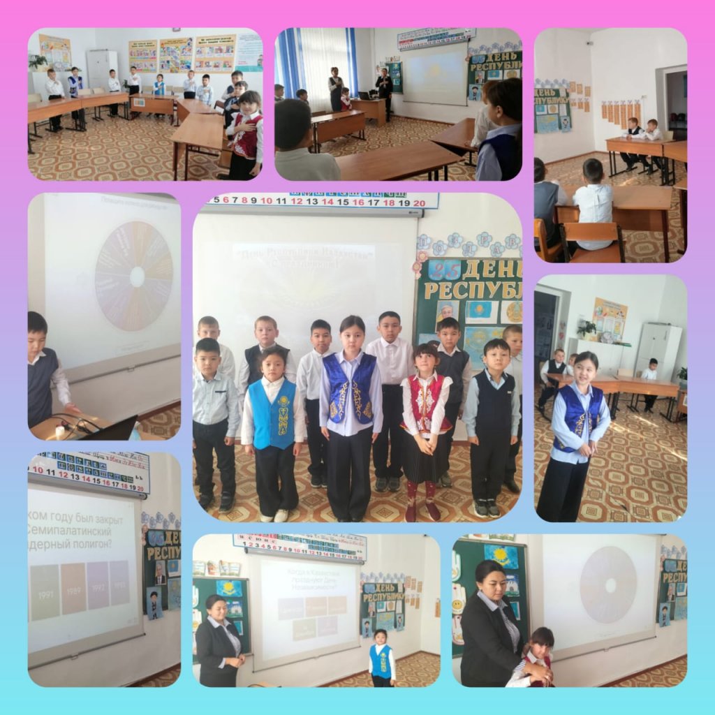 20 қазанда 1-4 сыныптарда Республика күніне арналған барлық сыныптарда сынып сағаты өткізілді. Іс-шараның мақсаты-мерекенің маңыздылығын түсіндіру, оқушыларға туған еліне деген құрмет пен отансүйгіштіктің құндылығын ояту, ҚР Мемлекеттік рәміздері туралы мәлімет беру.